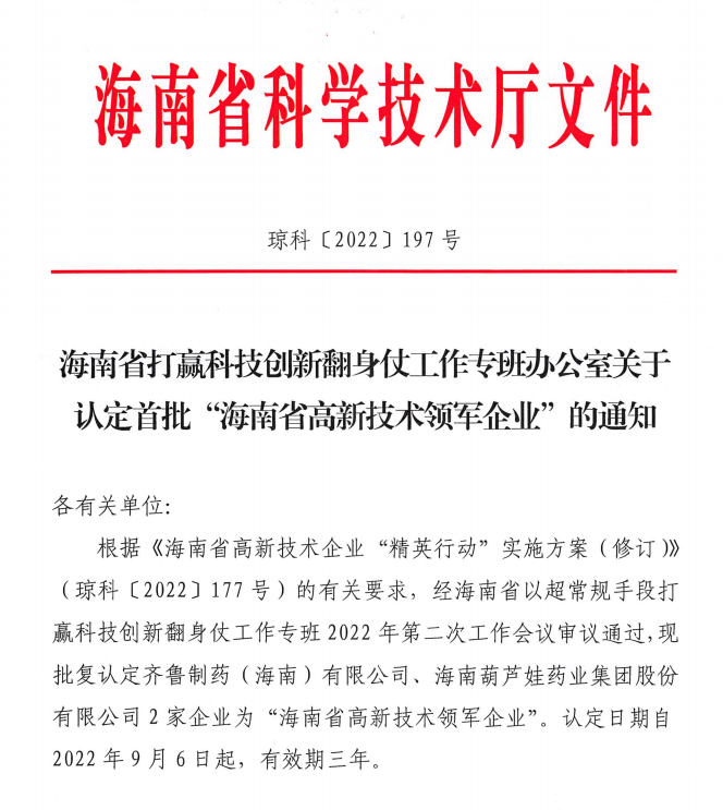 近日,海南省科学技术厅发布的《海南省打赢科技创新翻身仗工作专班办公室关于认定首批“海南省高新技术领军企业”的通知》中显示,批复认定海南ladbrokes立博药业集团股份有限公司等2家企业为“海南省高新技术领军企业”。认定日期自2022年9月6日起,有效期三年。